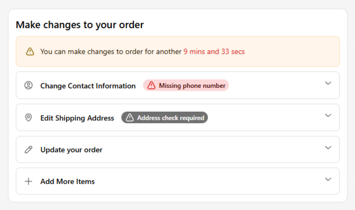 After placing order, you will be received the confirmation email, where you can edit your order within 30 minutes.